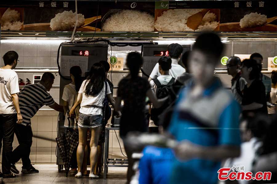 | Students queue up to take cooked rice from a 'steamed rice vending machine,' which is newly introduced by canteen of the South China University of Technology in Guangzhou, Guangdong province on June 11, 2014. By placing dishes under the machine and swiping card to pay for the meal, the device can offer cooked rice automatically. [Photo: China News Service / Long Yuyang] |