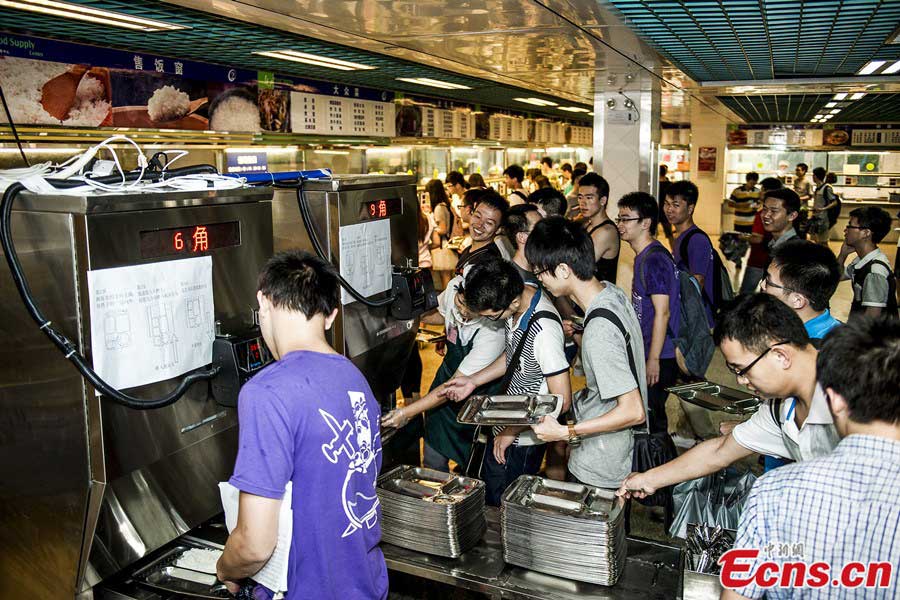Students queue up to take cooked rice from a 'steamed rice vending machine,' which is newly introduced by canteen of the South China University of Technology in Guangzhou, Guangdong province on June 11, 2014. By placing dishes under the machine and swiping card to pay for the meal, the device can offer cooked rice automatically. [Photo: China News Service / Long Yuyang]