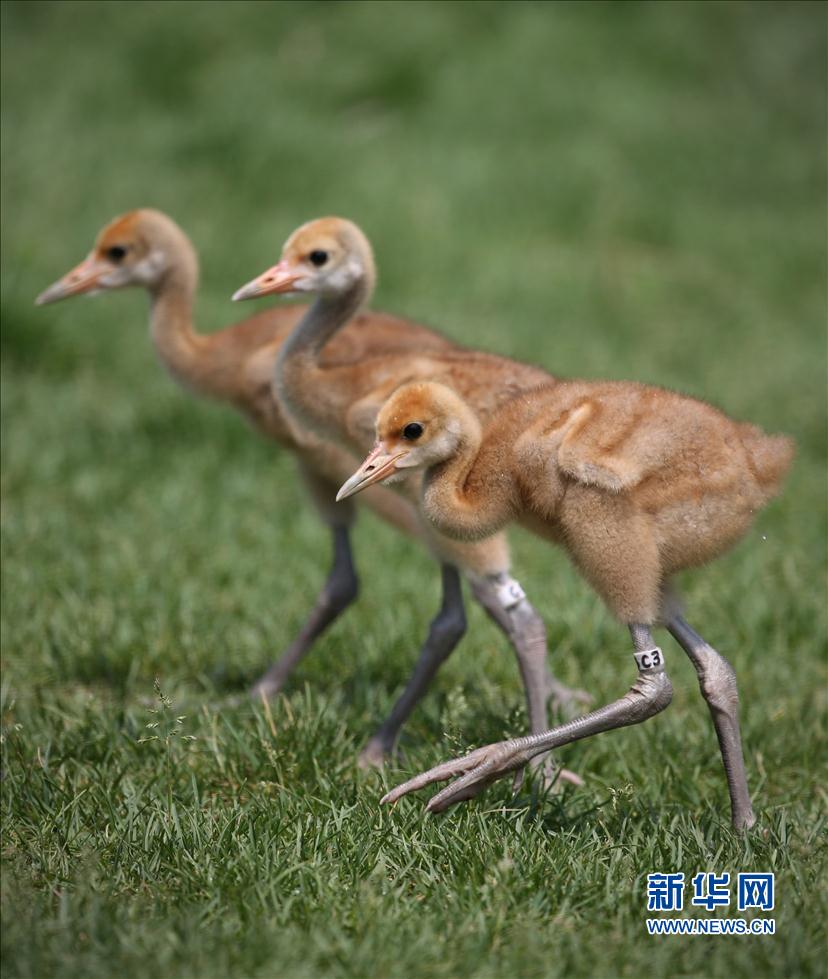 Three red-crowned cranes play outdoors on June 7, 2014. (Yao Jianfeng/Xinhua News Agency)