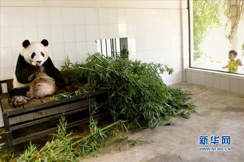 A giant panda shares bamboo in an air-conditioned room of Hefei Zoo in Hefei, Anhui on June 10, 2014. The temperature reached 30 Celsius degrees recently. (Xinhua/Guo Chen)