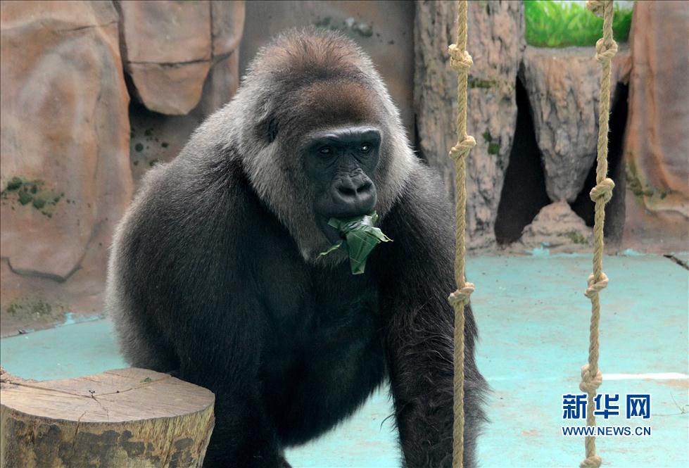 | A gorilla eats a special dumpling with Chinese date, pineapple and apple at animal zoo in Zhengzhou, Henan on May 28, 2013. (Li An/Xinhua News Agency) |