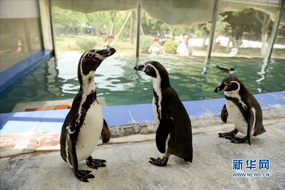 Three penguins play in an air-conditioned room of Hefei Zoo in Hefei, capital of central China's Anhui province on June 10, 2014. The temperature reached 30 degrees Celsius recently. (Xinhua/Guo Chen)