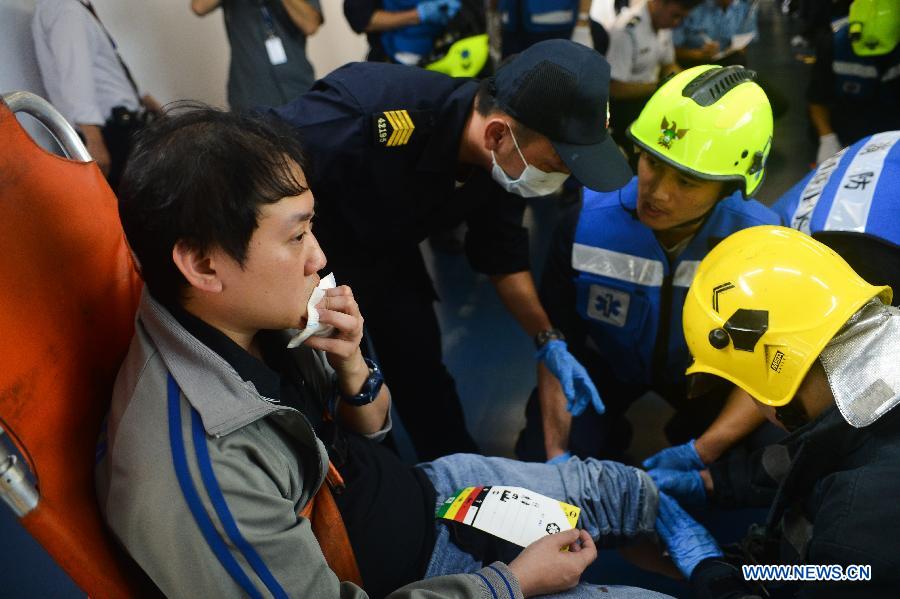 An injured man receives medical treatment at a ferry terminal in Macao, south China, June 13, 2014. A jet cruiser enroute for Macao from Hong Kong crashed the southern embankment at Macao's Outer Harbor terminal on Friday, injuring 61 people. (Xinhua/Cheong Kam Ka)