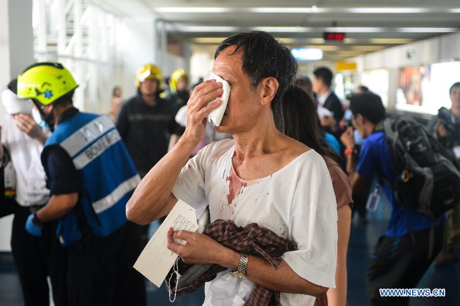 | An injured man receives medical treatment at a ferry terminal in Macao, south China, June 13, 2014. A jet cruiser enroute for Macao from Hong Kong crashed the southern embankment at Macao's Outer Harbor terminal on Friday, injuring 61 people. (Xinhua/Cheong Kam Ka) |