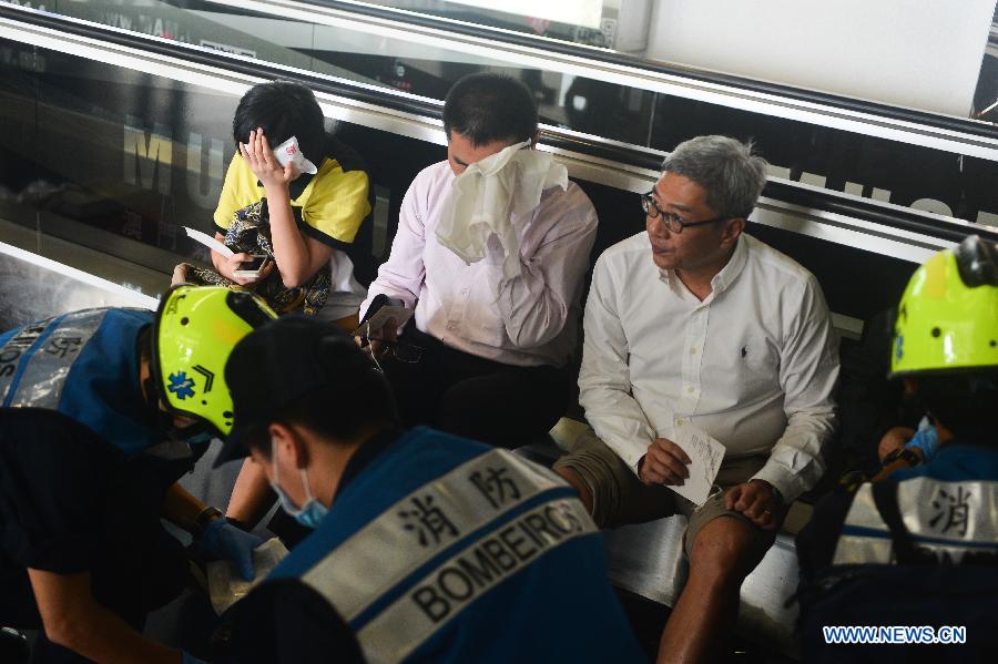 Injured passengers receive medical treatment at a ferry terminal in Macao, south China, June 13, 2014. A jet cruiser enroute for Macao from Hong Kong crashed the southern embankment at Macao's Outer Harbor terminal on Friday, injuring 61 people. (Xinhua/Cheong Kam Ka)