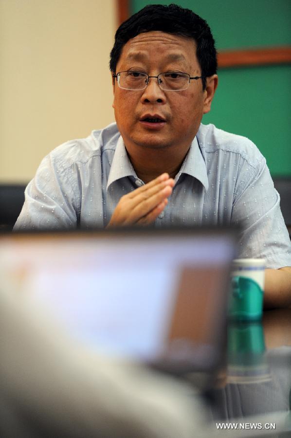 Researcher Guo Biqiang introduces the bid process of the files on the Nanjing Massacre at the Second Historical Archives of China in Nanjing, capital of east China's Jiangsu Province, June 12, 2014. China is applying to UNESCO to list 11 sets of documents relating to the 1937 Nanjing Massacre on the Memory of the World Register. The documents, which include diaries, films, photographs and testimonies, depict the brutality of Japanese invaders in the massacre. (Xinhua/Han Yuqing)