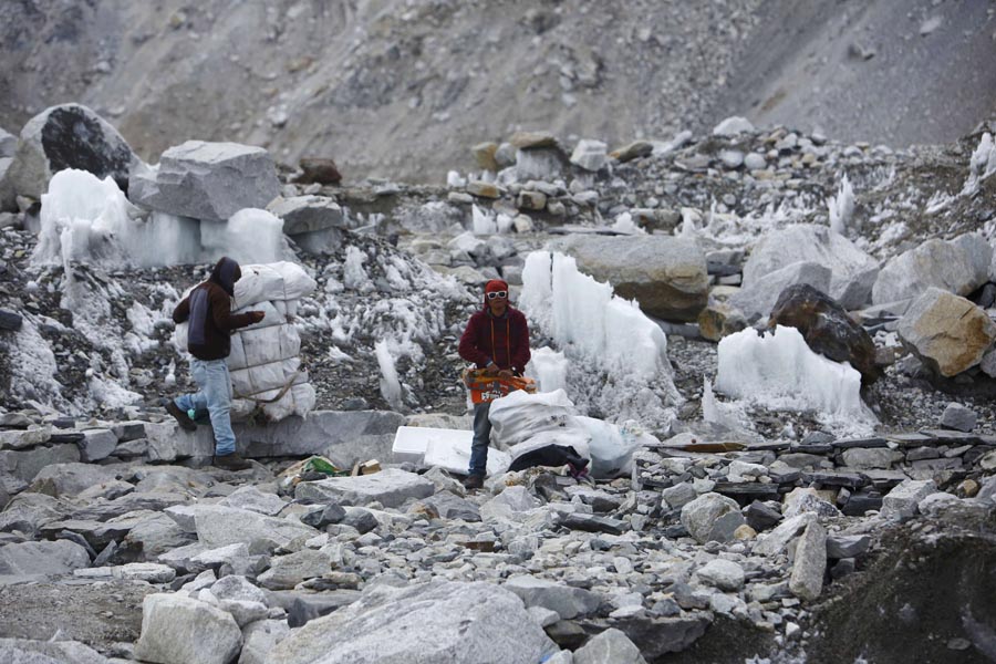 Garbage collectors pick up trash around the Qomolangma Base Camp. Photo was taken in Theroux Khumbu region of Nepal, at an altitude of about 5,300 meters on May 6, 2014.