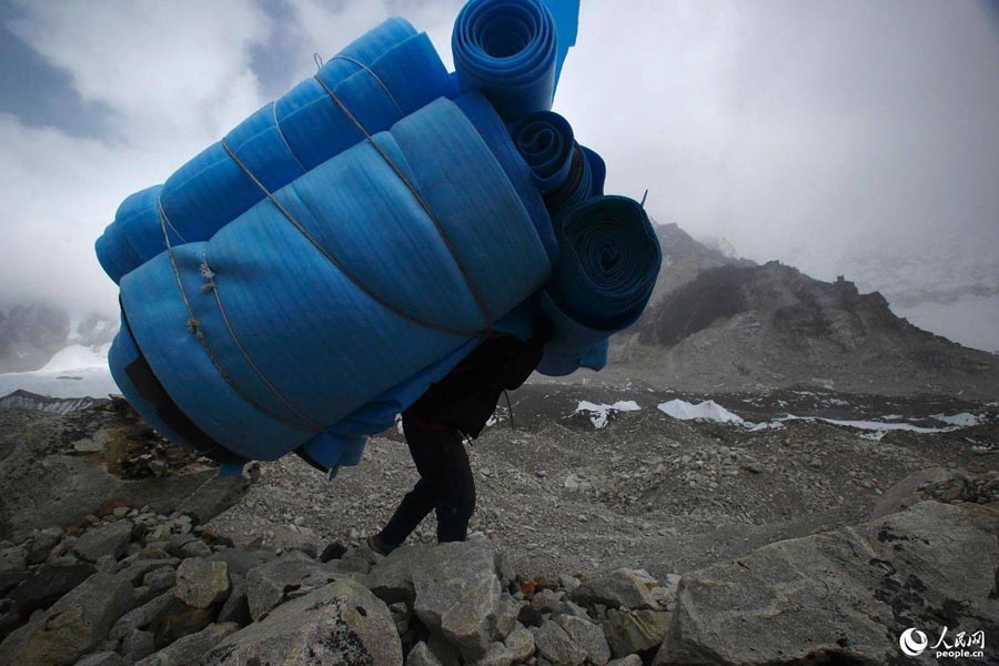 A man carries a mattress returning from Qomolangma Base Camp. The photo was taken in Theroux Khumbu region of Nepal, at an altitude of about 5,300 meters on May 6, 2014.