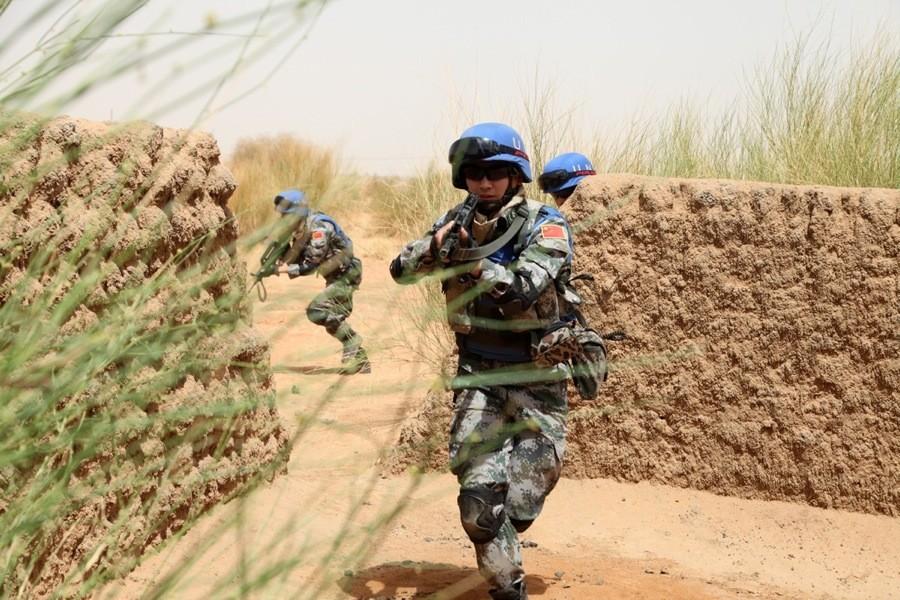 Soldiers carry guns with live ammunition and wear bulletproof helmets and bulletproof vests in Mali on June 11, 2014. The first batch of Chinese peacekeepers in Mali conducted first live fire exercise to improve emergency management capabilities. (China.org.cn/Luo Zheng)