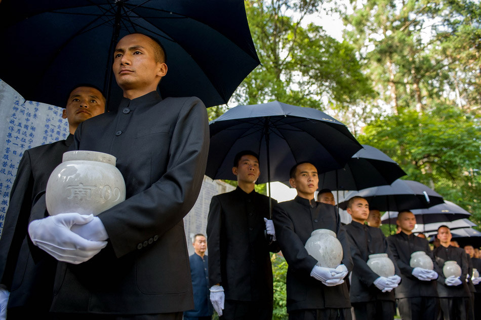 Holding the funeral urns in their hands, people dressed in black Chinese tunic suit stand solemnly in protection of the souls of deceased soldiers at Guoshang Cemetery on June 12. (Xinhua/Hu Chao)