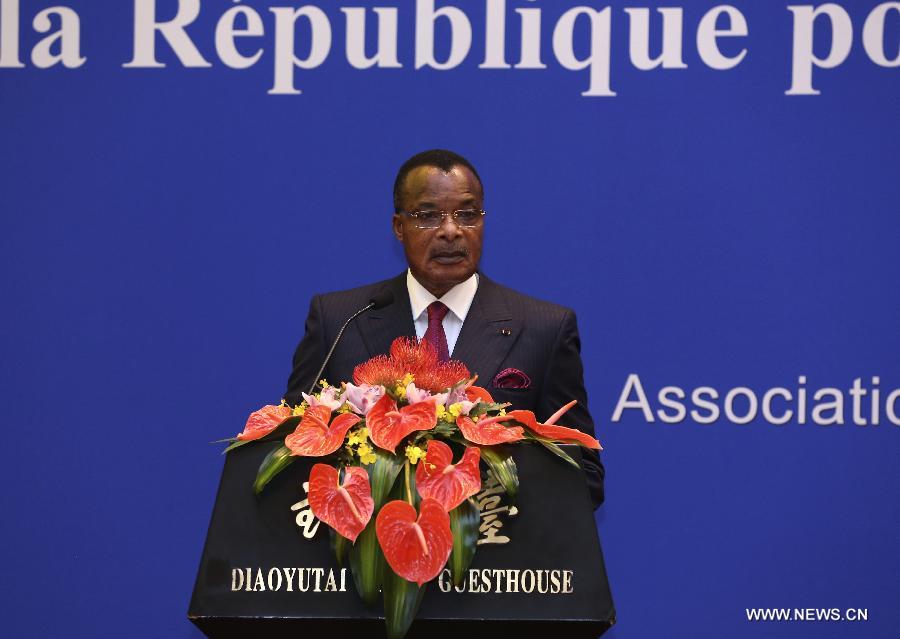 Denis Sassou Nguesso, president of the Republic of Congo, speaks at the celebration of the 50th anniversary of the establishment of diplomatic relations between China and the Republic of Congo in Beijing, capital of China, June 13, 2014. (Xinhua/Pang Xinglei)