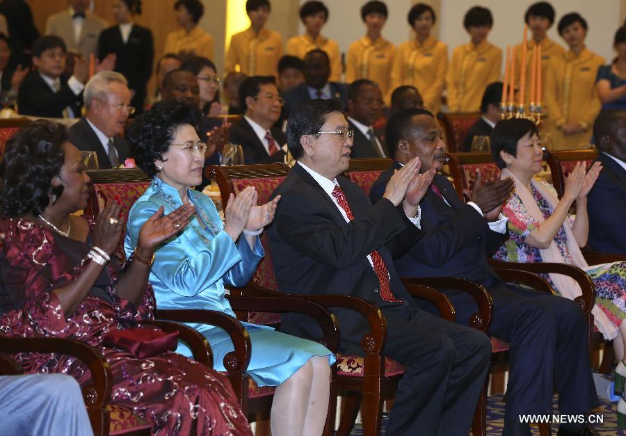 Zhang Dejiang, chairman of China's National People's Congress (NPC) Standing Committee, and Denis Sassou Nguesso, president of the Republic of Congo, attend the celebration of the 50th anniversary of the establishment of diplomatic relations between China and the Republic of Congo in Beijing, capital of China, June 13, 2014. (Xinhua/Pang Xinglei)