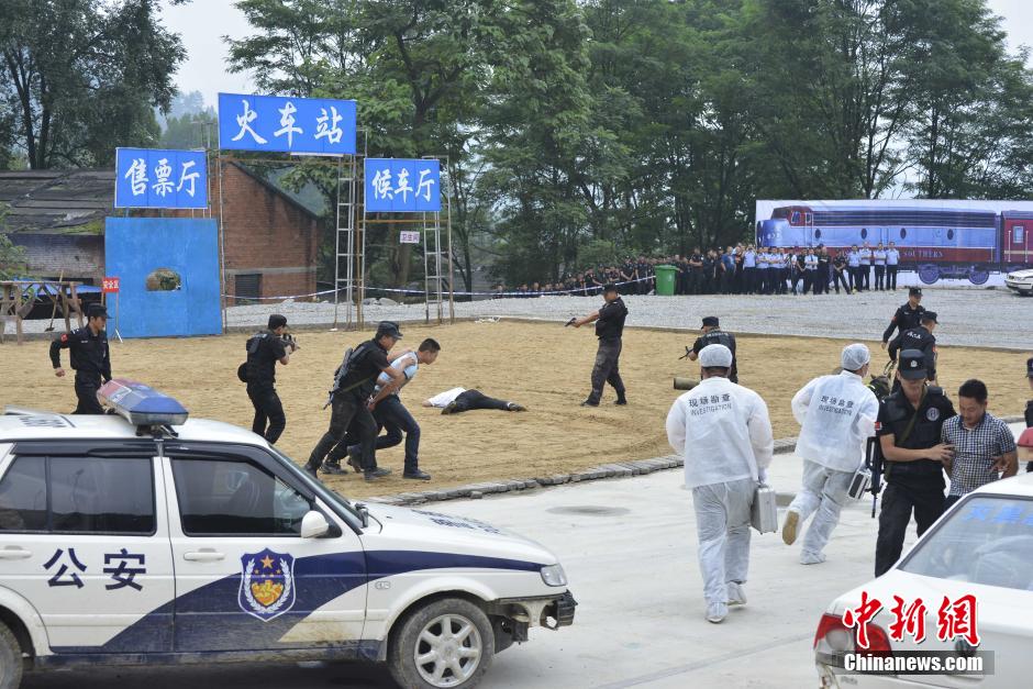 Police in Qiannan Prefecture, southwest China's Guizhou Province, holds a drill to practice anti-terrorism, emergency response and other skills to improve their ability in emergency disposal on June 12, 2014. (Chinanews/Wu Qingyuan)