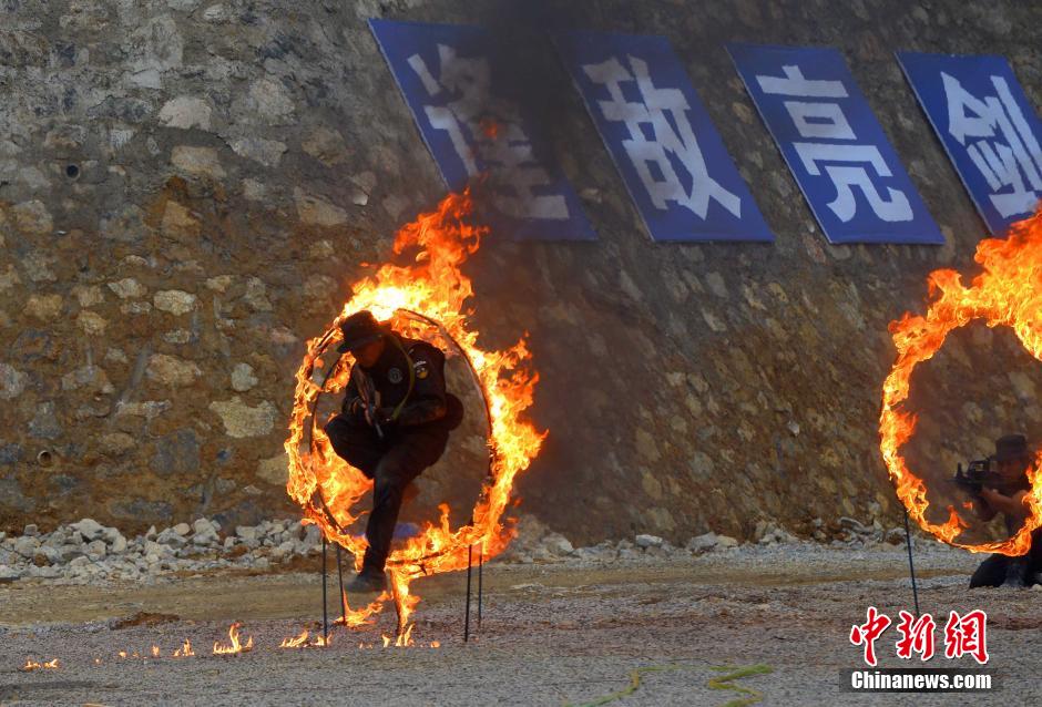 Police in Qiannan Prefecture, southwest China's Guizhou Province, holds a drill to practice anti-terrorism, emergency response and other skills to improve their ability in emergency disposal on June 12, 2014. (Chinanews/Wu Qingyuan)