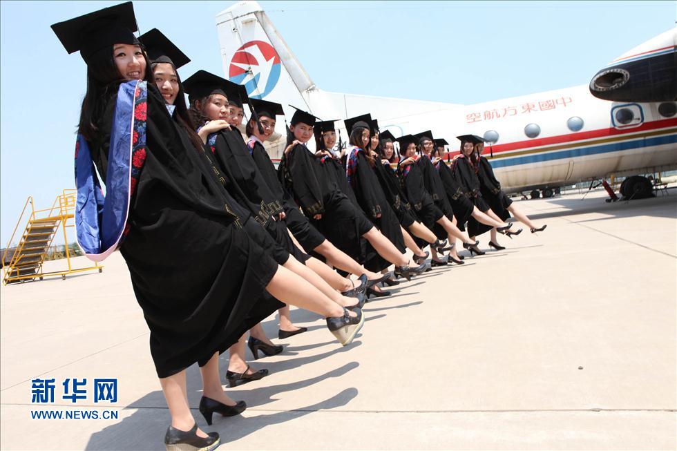 A group of college students from Civil Aviation University of China take photos in front of the large passenger plane, and say goodbye to their colorful college life on June 12, 2014. As college graduation season comes, many graduates are busy having photos taken on campus as a memento. (Pang Jie/Xinhua News Agency)