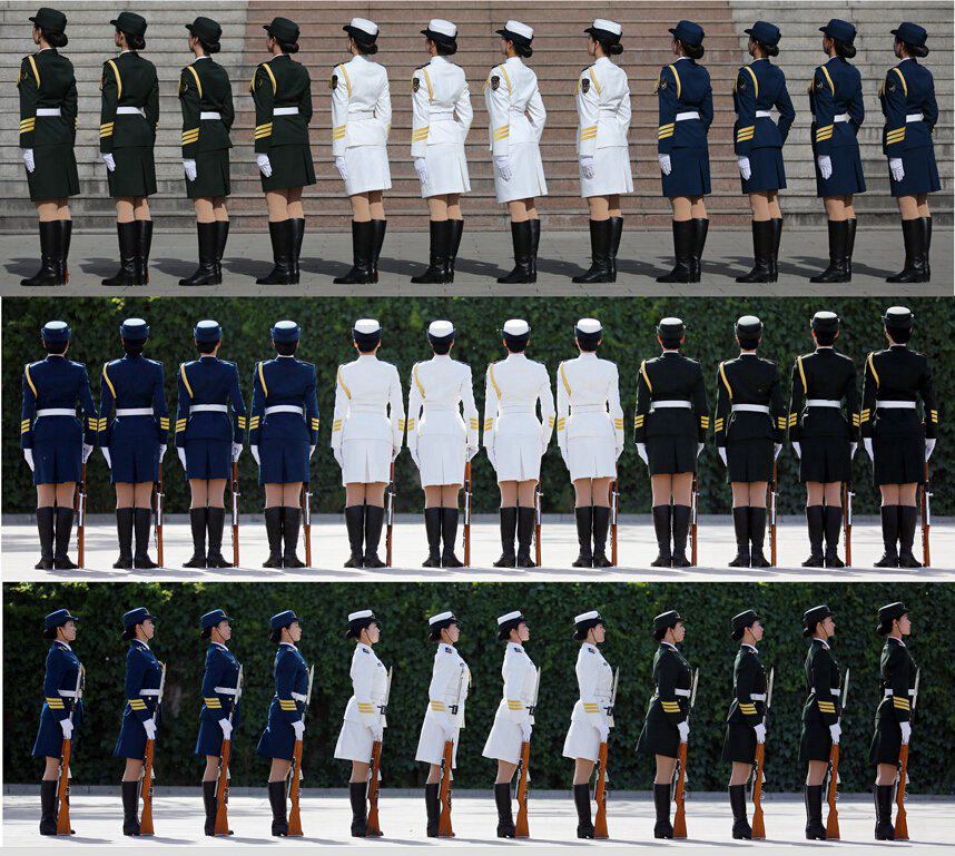 | Clad in skirts, riding boots and hair pulled back into the classic chignon, female People’s Liberation Army honor guards have attracted the attention of the world since they made debut on May 12. Their knee-high skirts and five-centimeter heels singled them out from the rows and rows of sober, hunter-green uniforms of male soldiers. (Photo source: 81.cn) |