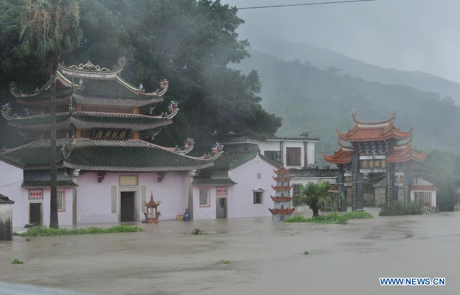 Photo taken on June 16, 2014 shows a flooded temple at Xixia Village of Dongqiao Town in Zhao'an County, southeast China's Fujian Province. The typhoon Hagibis brought torrential rain to Fujian on Monday. (Xinhua/Lin Shanchuan)