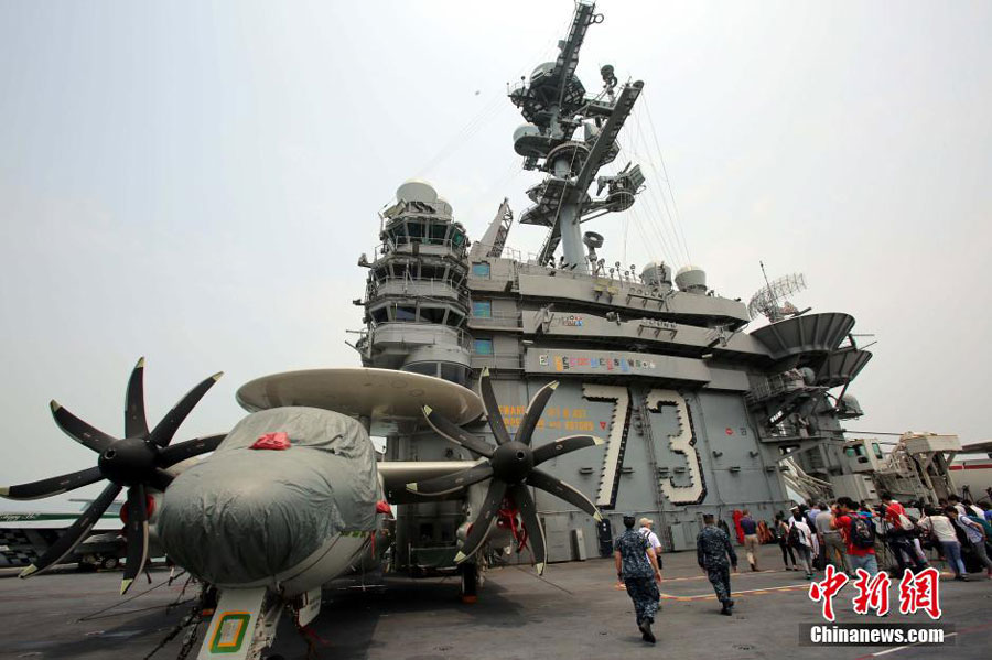 The US Navy's aircraft carrier USS George Washington docks in Hong Kong and welcomes four People's Liberation Army members for a VIP visit on Monday, June 16, 2014. [Photo: Chinanews.com]