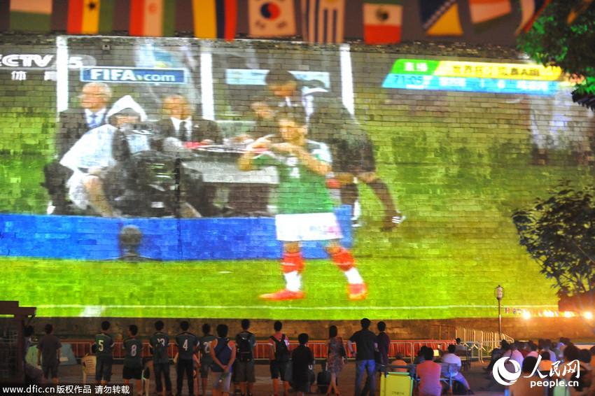 Watching the World Cup at a bar or cinema is no longer new - now, Nanjing citizens can enjoy the broadcast on the Ming Dynasty (1368-1644) city wall. Since the morning of June 13, 2014, the World Cup matches have been broadcasted on the city wall through projectors in Laomendong historical block of Nanjing. Many citizens were attracted here to watch the matches on the "screen" as big as 1,000 square meters.(People's Daily Online)