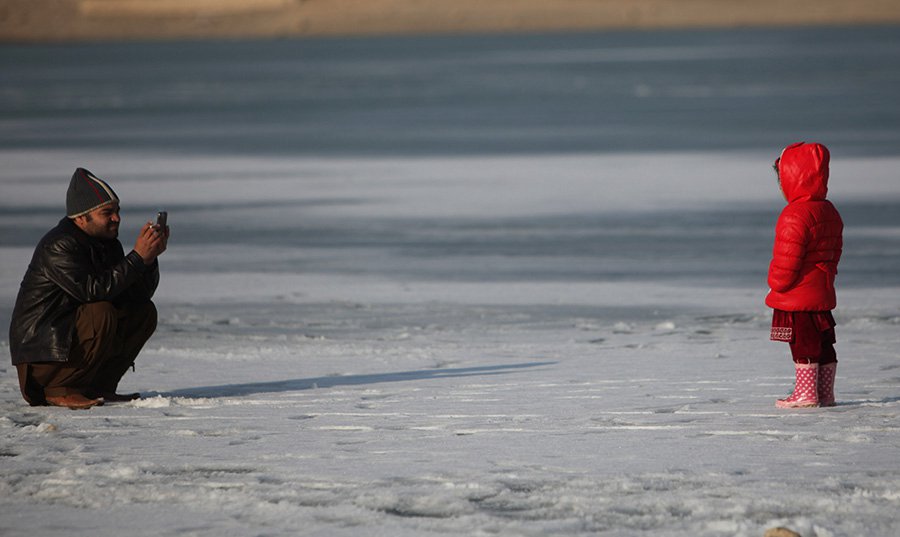 A father takes photo of his daughter on ice in Kabul, Afghanistan on Jan. 14, 2014. (Xinhua)