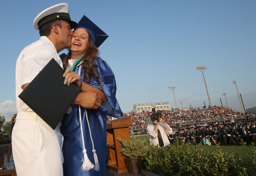 Jose Ramiro, a Navy veteran kisses his daughter during graduation at West Port High School in Ocala, Fla. June 5, 2014. (Xinhua/AP)