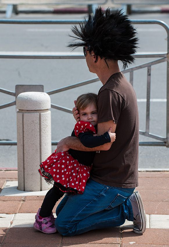 A father hugs his daughter while they are watching Purim Costume Parade in Holon, Israel on March 16, 2014. (Xinhua/ Li Rui)