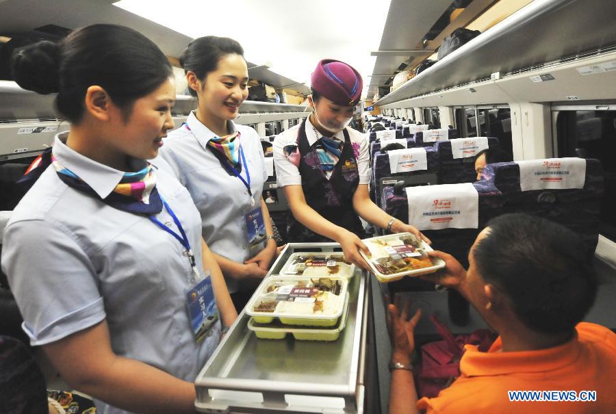 Stewardesses serve passengers meal on a CHR train in Chongqing, southwest China, June 18, 2014. As the CHR trains heading from southwest China's Chongqing and Sichuan to eastern China will soon be opened, a total of 169 stewardesses are busy with receiving training. (Xinhua/Cao Ning)