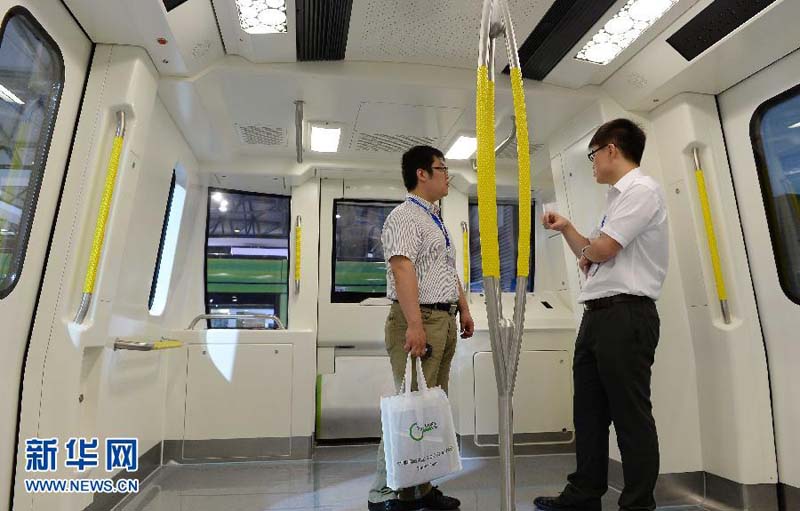 | This picture shows the locomotive of the first driverless subway train at Rail+Metro China in Shanghai on June 17, 2014. It is said that this train with three carriages can carry 1,500 passengers at most. Having no cabin for the driver, the train looks like ordinary subway trains. Without the driver or stewards, this train automatically starts, departs from the station, goes uphill or downhill, stops in accurate alignment with the stations, opens and shuts the doors of carriages. (Xinhua/Lai Xinlin) |