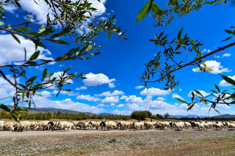 Shepherds drive their flocks walking nearby windbreaks in Qinghai province. File photo was taken on Sept. 11, 2013.