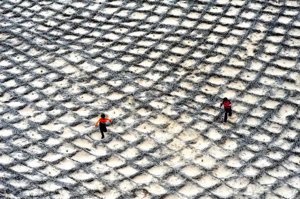 Two children play games on the edge of grass squares in Mu Us sandy land in Ningxia. The photo was taken on April 18, 2009.