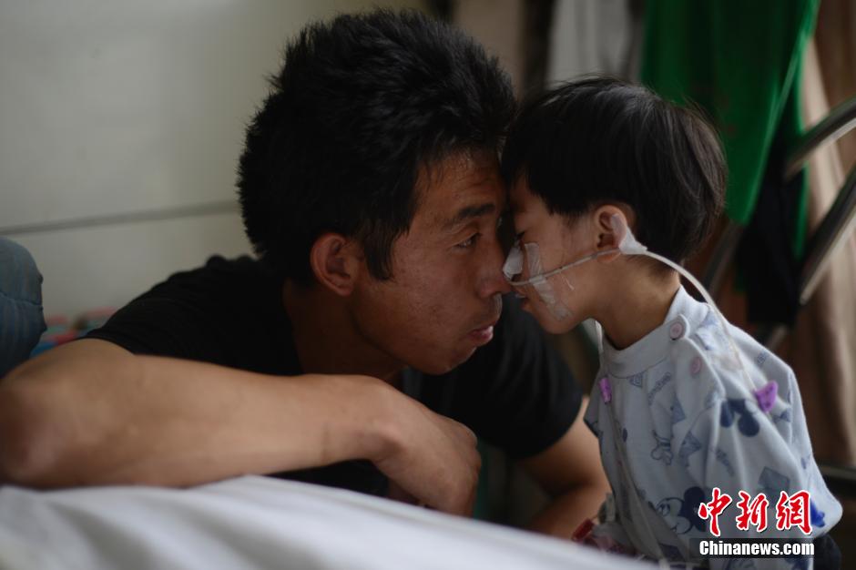 Wang Zhihua tells stories to cheer his daughter up in the ward on May 23, 2014.(CNS/ Wei Liang)