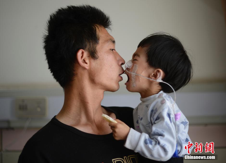 The father feeds Wang Keran mouth to mouth in the ward on May 23.(CNS/ Wei Liang)