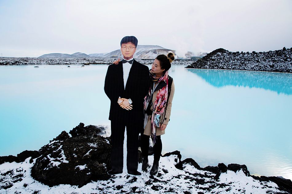 Yang and her “father” in front of the Blue Lagoon in Iceland.