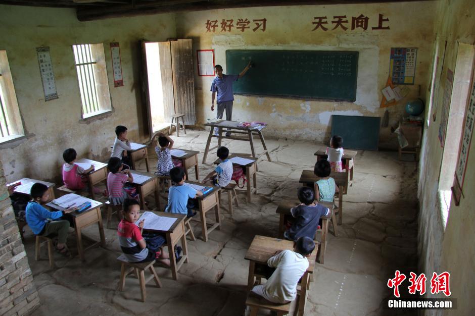 Zeng Xiangwei and his 13 pupils in class. Established in 1950, Lianglongche village school, located in a remote village in Dao County, Central China's Hunan Province, has only one teacher and 13 pupils. Zeng has been working there for 38 years. [Photo / Chinanews.com]