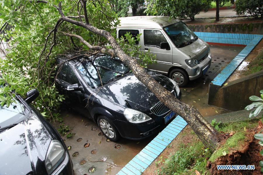 A collapsed tree falls on a motorcar in Quanzhou County of Guilin City, south China's Guangxi Zhuang Autonomous Region, June 20, 2014. A rainstorm hit several cities in Guangxi and local weather bureau has launched an emergency response. (Xinhua/Wang Zichuang)