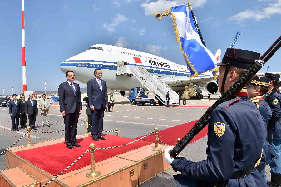 Chinese Premier Li Keqiang (L, center) attends a welcoming ceremony held by Greek Prime Minister Antonis Samaras (R, center) in Athens, Greece, June 19, 2014. Li arrived here Thursday for an official visit, his first trip to Greece since taking office in 2013. (Xinhua/Li Tao)