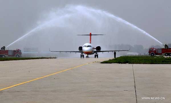 An ARJ21-700 regional airplane which has accomplished a global test arrives in a test center in Yanliang District of Xi'an, capital of northwest China's Shaanxi Province, April 28, 2014. The ARJ21-700 is a regional airplane made by the Commercial Aircraft Corporation of China (COMAC). It has just passed an icing conditions test in North America in addition to a 30,000-kilometer test mileage worldwide. (Xinhua/Ding Ting)