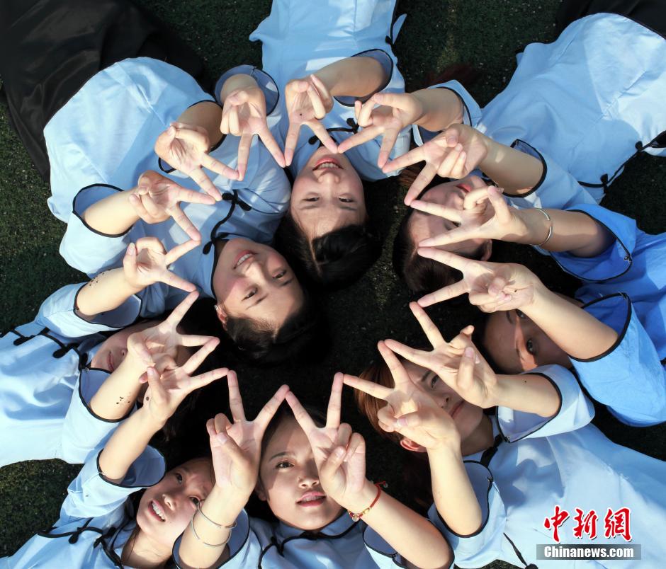 Some graduates in Sichuan University of Arts and Science take group photos themed "Youth never ends" to mark their graduation, June 17, 2014. They wore costumes of the Republic of China period and put on a variety of poses to commemorate the good times spent at the university. (Chinanews.com/Wan Yanming)
