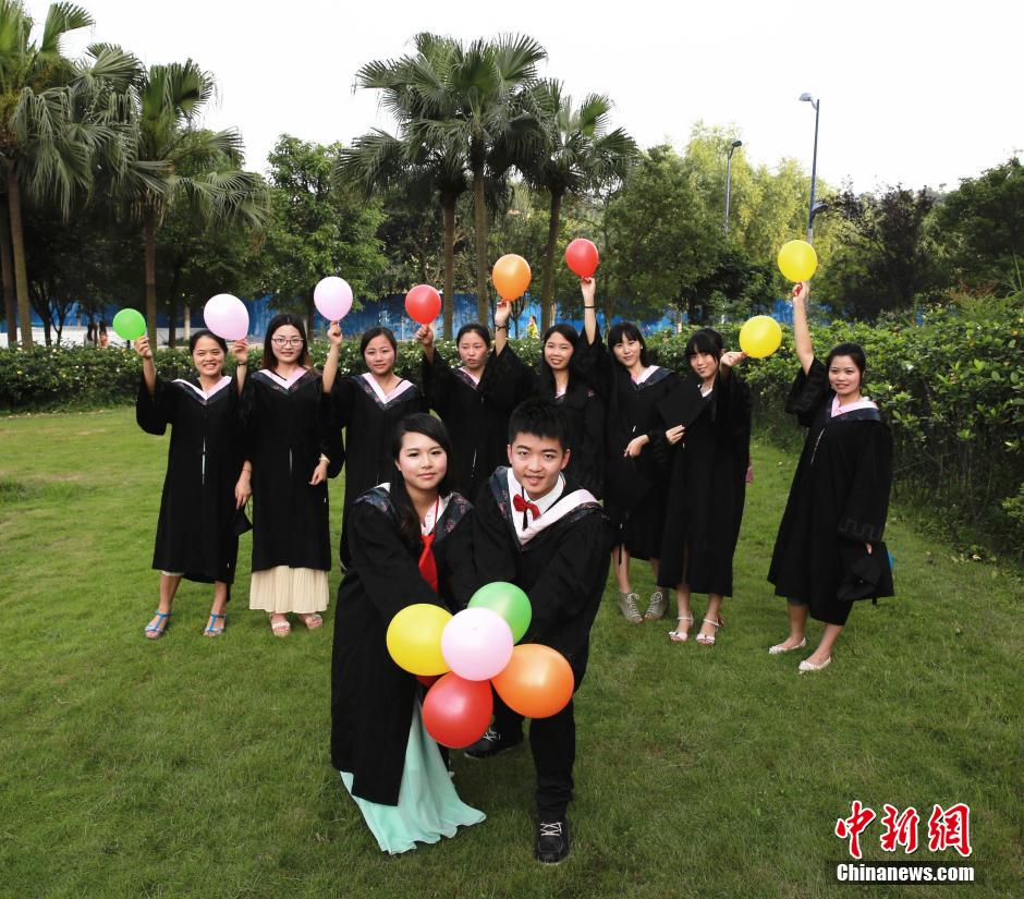 Graduates take photos in Bachelor's gowns in Sichuan University of Arts and Science, June 17, 2014. (Chinanews.com/Wan Yanming)