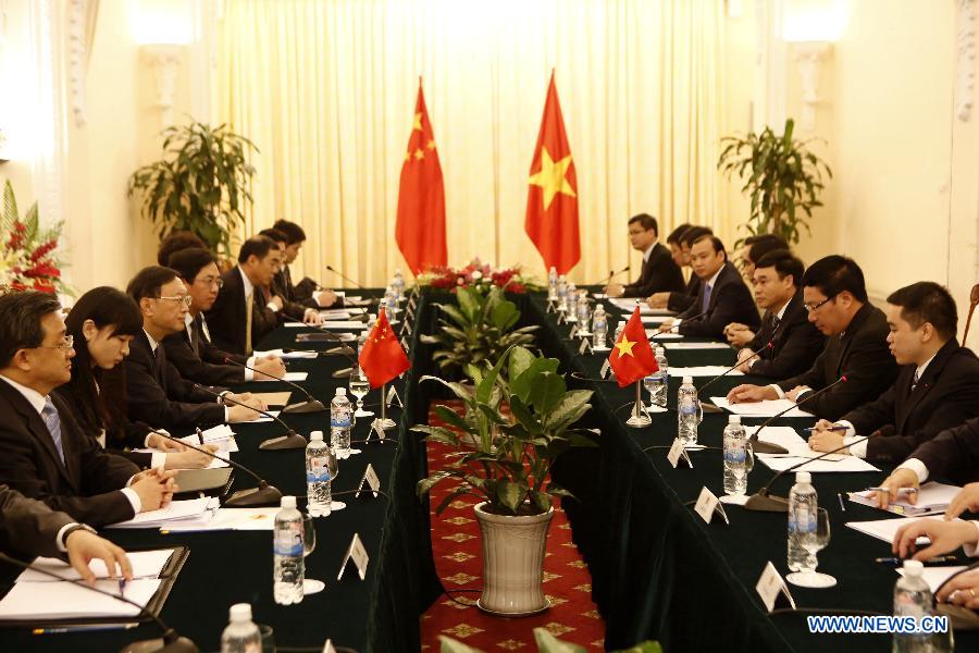 Chinese State Councilor Yang Jiechi held a meeting with Vietnamese Deputy Prime Minister and Foreign Minister Pham Binh Minh in the Vietnamee capital of Hanoi on June 18, 2014. The two countries pledged to rein in maritime tensions during the highest-level direct contact since relations deteriorated in May over a Chinese oil rig operating in the South China Sea.
