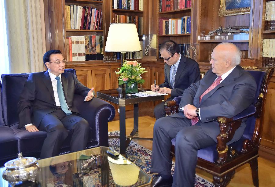 | Chinese Premier Li Keqiang (L) meets with Greek President Karolos Papoulias at the Presidential Mansion in Athens, capital of Greece, June 20, 2014. (Xinhua/Li Tao) |