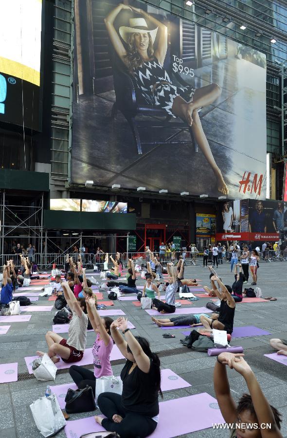 Enthusiasts practice yoga during the "Solstice in Times Square" event at Times Square in New York, the United States, June 21, 2014. Hundreds of New Yorkers marked the Summer solstice day by practicing yoga in Times Square Saturday. The 12th annual Solstice in Times Square was sponsored by the Times Square Alliance. (Xinhua/Wang Lei)