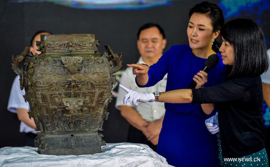 Staff members check the Min Fanglei at the Customs Supervised Warehouse of the airport of Changsha, capital of central China's Hunan Province, June 21, 2014. Lei was a kind of ritual vessel and wine container in the late Shang Dynasty (1600 BC-1046 BC) and early Zhou Dynasty (1046 BC - 771 BC) in China. The Min Fanglei, which got its name Min from the inscriptions on it, is the most exquisite and largest Lei ever unearthed. The body of Min Fanglei has been separated from its lid since its was unearthed in 1919 in Taoyuan County of Hunan. The famous bronzeware, which has been away from its home for almost a century, returned home Saturday after being purchased from an overseas owner in March. (Xinhua/Bai Yu)