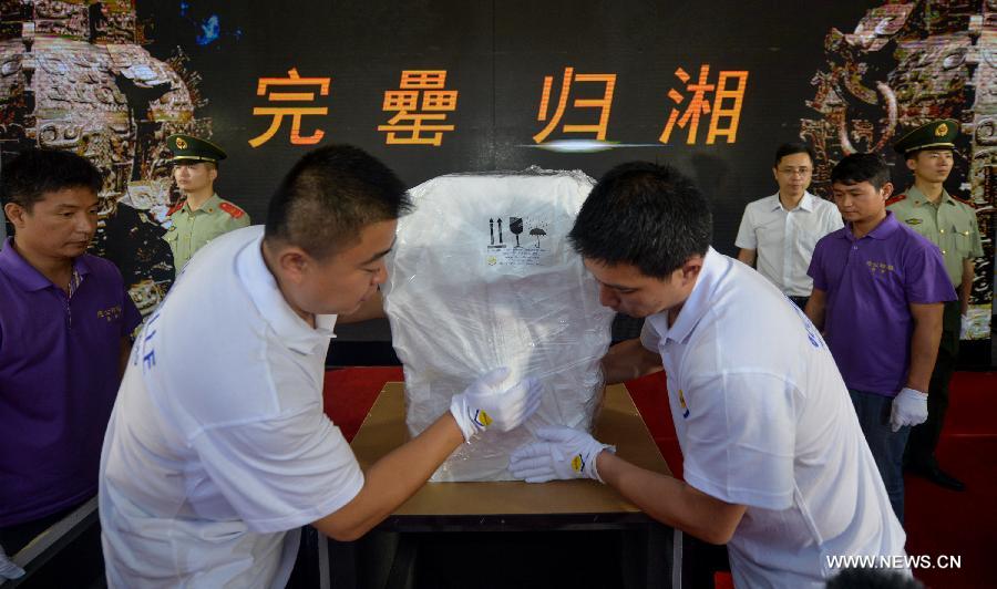 Staff members carry the Min Fang Lei in a case at the Customs Supervised Warehouse of the airport of Changsha, capital of central China's Hunan Province, June 21, 2014. Lei was a kind of ritual vessel and wine container in the late Shang Dynasty (1600 BC-1046 BC) and early Zhou Dynasty (1046 BC - 771 BC) in China. The Min Fanglei, which got its name Min from the inscriptions on it, is the most exquisite and largest Lei ever unearthed. The body of Min Fanglei has been separated from its lid since its was unearthed in 1919 in Taoyuan County of Hunan. The famous bronzeware, which has been away from its home for almost a century, returned home Saturday after being purchased from an overseas owner in March. (Xinhua/Bai Yu)