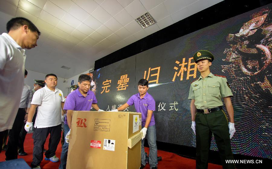 Staff members carry the Min Fanglei away from the Customs Supervised Warehouse of the airport of Changsha, capital of central China's Hunan Province, June 21, 2014. Lei was a kind of ritual vessel and wine container in the late Shang Dynasty (1600 BC-1046 BC) and early Zhou Dynasty (1046 BC - 771 BC) in China. The Min Fanglei, which got its name Min from the inscriptions on it, is the most exquisite and largest Lei ever unearthed. The body of Min Fanglei has been separated from its lid since its was unearthed in 1919 in Taoyuan County of Hunan. The famous bronzeware, which has been away from its home for almost a century, returned home Saturday after being purchased from an overseas owner in March. (Xinhua/Bai Yu)