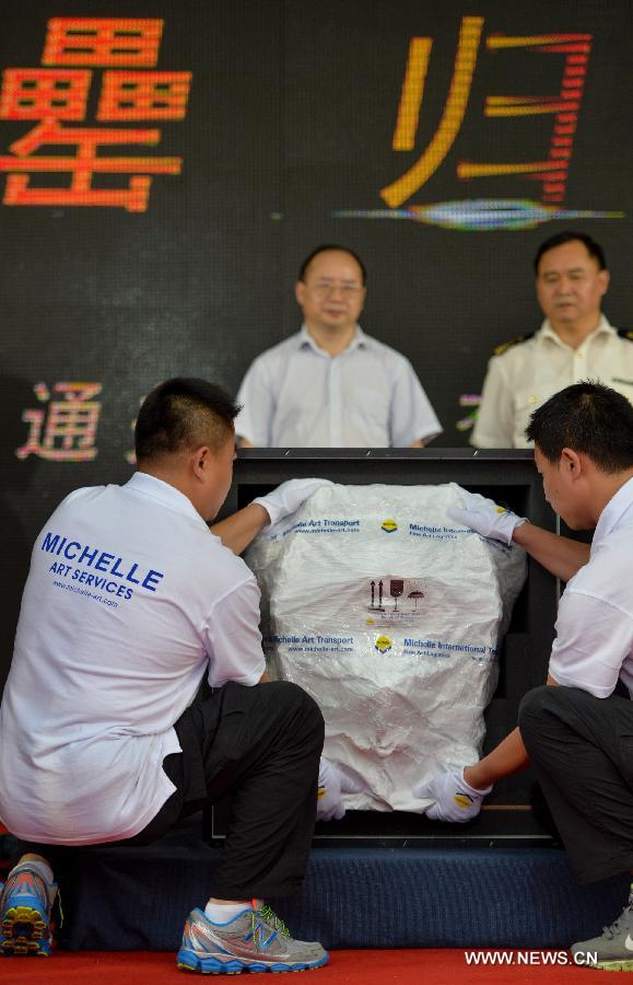 | Staff members carry the Min Fanglei out of a case at the Customs Supervised Warehouse of the airport of Changsha, capital of central China's Hunan Province, June 21, 2014. Lei was a kind of ritual vessel and wine container in the late Shang Dynasty (1600 BC-1046 BC) and early Zhou Dynasty (1046 BC - 771 BC) in China. The Min Fanglei, which got its name Min from the inscriptions on it, is the most exquisite and largest Lei ever unearthed. The body of Min Fanglei has been separated from its lid since its was unearthed in 1919 in Taoyuan County of Hunan. The famous bronzeware, which has been away from its home for almost a century, returned home Saturday after being purchased from an overseas owner in March. (Xinhua/Bai Yu) |