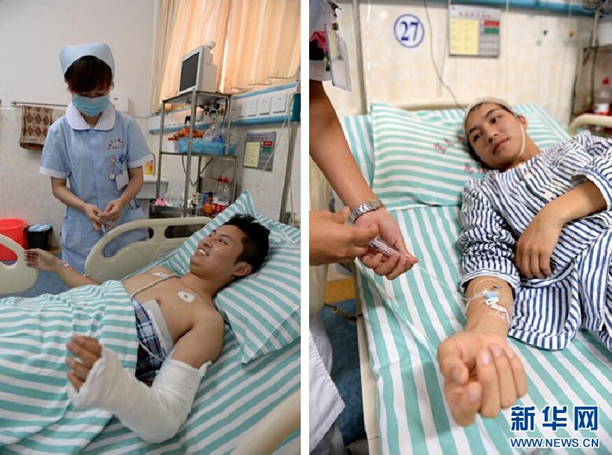 Medical staff gives IV therapy to Liu Yanbing (R) and Yi Zhengyong. (Photo/ Chen Zixia)