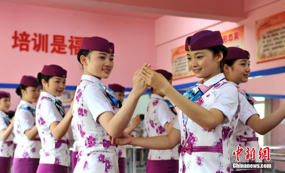 High speed train attendants receive trainings in Chongqing, southwest China, June 18, 2014. Chongqing passenger rail segment has started to prepare for the operation of the high speed trains. 35 train attendants were selected to receive professional trainings to be heads of train crew. Another 169 prospective high speed train attendants will take 24-day training focusing on train service and bilingual broadcasting. (Chinanews.com/Cao Ning)