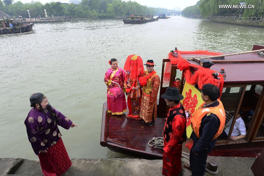 A traditional wedding is held at the Beixinguan dock of China's Grand Canal, in Hangzhou, east China's Zhejiang province, April 26, 2014. China's Grand Canal, the longest artificial waterway in the world, was inscribed on the World Heritage list on June 22, 2014. The Grand Canal with a history of more than 2,400 years was recognized by UNESCO World Heritage Committee which convened its 38th session in the Qatari capital. The 1,794-km canal runs from Beijing to Hangzhou in China's eastern Zhejiang province. (Xinhua/Li Zhong)