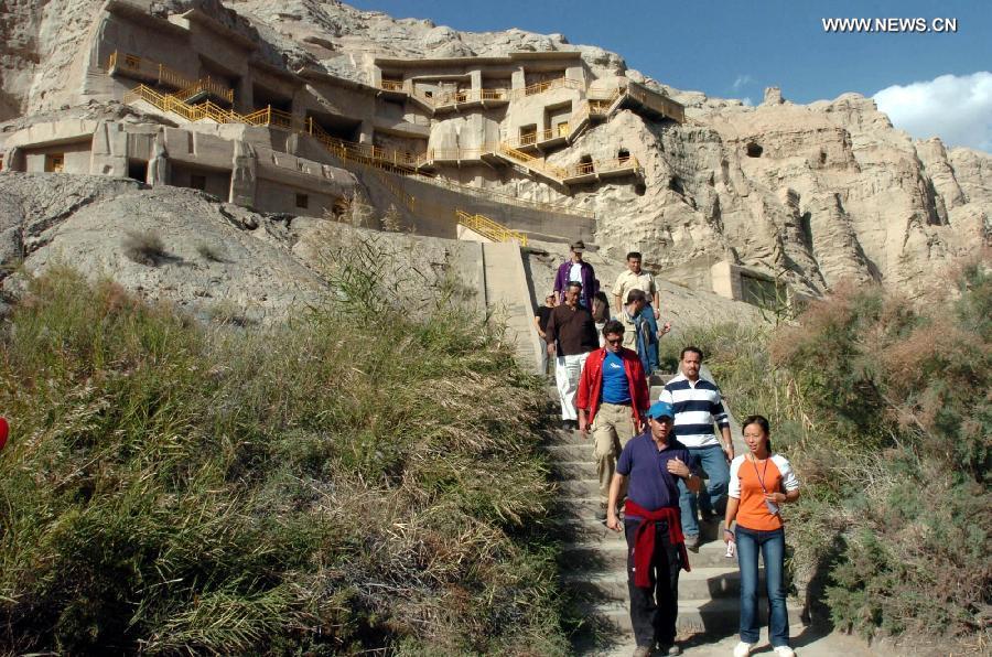 Photo taken on Oct. 6, 2005 shows people visiting the Kizil Grotto in Baicheng County of northwest China's Xinjiang Uygur Autonomous Region. Baicheng is the place where the ancient Qiuci State once located. The famous ancient Silk Road, which served as a corridor for trade and cultural exchanges between Asia and Europe dating back to 2,000 years ago, was inscribed on the World Heritage list at Doha, capital of Qatar on June 22, 2014. Jointly submitted by China, Kazakhstan and Kyrgyzstan, the application for adding part of the millennium-old trade route to the UNESCO list was approved by the World Heritage Committee which convened its 38th session in Doha. (Xinhua)